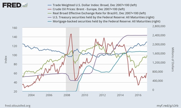 O gráfico 2 revela que de 2009 a 2014, com os ciclos de liquidez monetária, através da compra e acúmulo de títulos públicos e hipotecários pelo FED, a moeda norte-americana se desvaloriza. Com o fim dos ciclos de injeção monetária, em agosto de 2014, a moeda norte-americana se valoriza com severo impacto na desvalorização do real e do petróleo.
