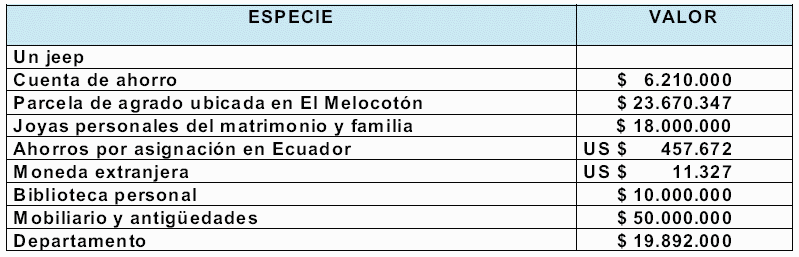 d.- Por escritura pública de fecha 7 de mayo de 1999 se acuerda separación de bienes entre Augusto Pinochet Ugarte y María Lucía Hiriart Rodríguez. Además, en ese mismo acto, y no obstante estar en conocimiento de los cónyuges las inversiones en el extranjero y de la propiedad de sociedades chilenas y con acciones al portador constituidas en el extranjero, se realiza liquidación parcial de los bienes incluyendo solamente los públicamente manifestados con el objeto de evitar se les privara de aquellos que estimaron de mayor relevancia, por posibles embargos derivados de los procesos seguidos en el exterior. Es así como los cónyuges se adjudicaron hijuelas ascendentes a $426.763.007, equivalente a 28.804,16 unidades de fomento, que hace un total de $853.526.014, equivalente a 57.608,32 unidades de fomento, que están constituidas por los siguientes bienes: